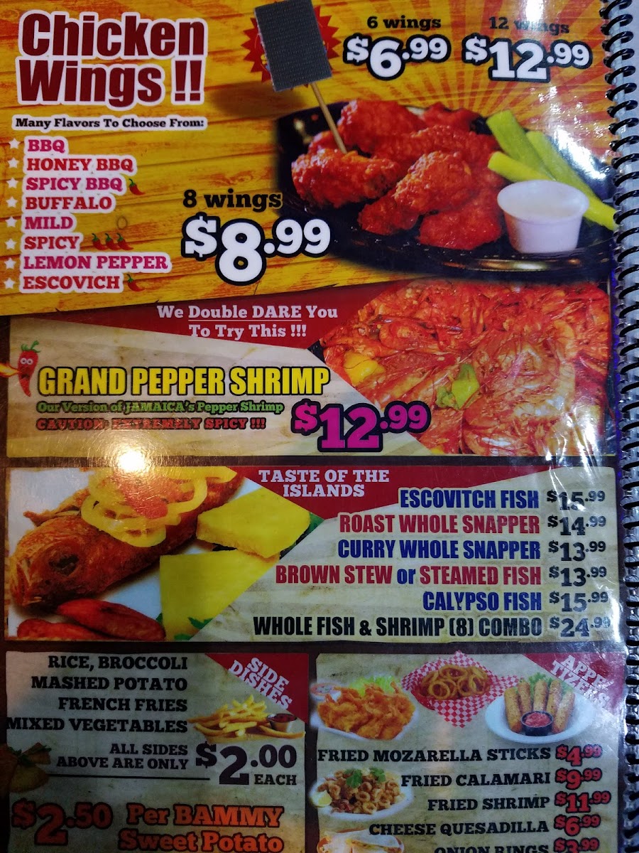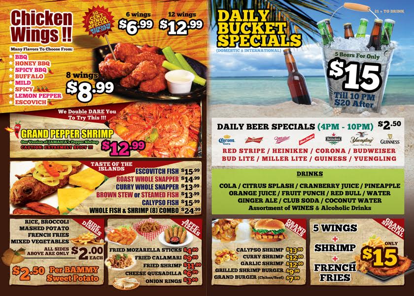 The menu features an array of tantalizing options, headlined by their mouthwatering burgers such as the Grand Bazaar Burger and the rich Cuban Burger, each crafted from 100% ground beef. Seafood lovers can indulge in dishes like the exquisite Escovitch Fish or delectable Grilled Shrimp, all highlighting the freshness of the ingredients.